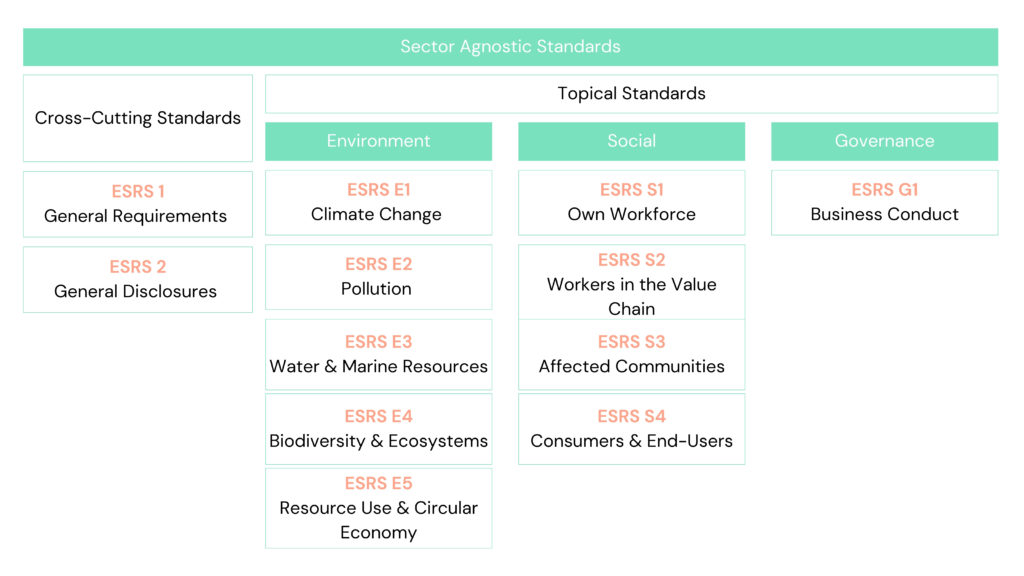 In total, there are twelve ESRSs, which detail disclosures and metrics. These twelve standards are sector-agnostic, consisting of two cross-cutting standards and ten topical standards. All the standards are mandatory for companies falling under the CSRD. However, while the ten topical standards are mandatory, the specific disclosures within these standards are subject to the materiality assessment. In contrast, the cross-cutting standards are mandatory in their entirety and are not subject to the materiality assessment.